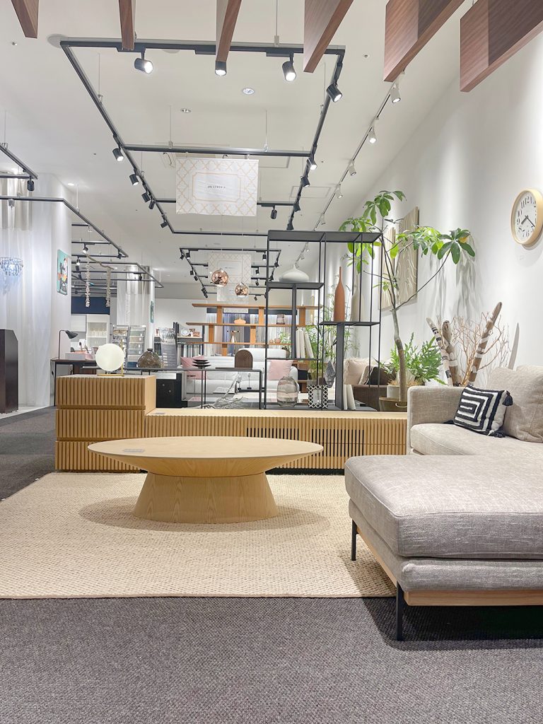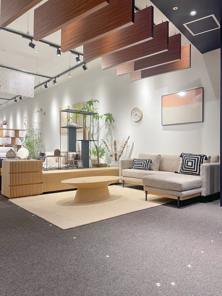 ナチュラルブラックのNEWシーンを組みました。 ベースは優しいナチュラルの家具やラグに、シェルフ・ソファ脚部のブラックで空間を引き締めております。