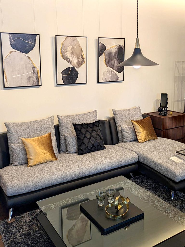 店内のしつらえは、シーズン毎にテーマを設定し、スタッフ自身で家具と小物などを飾り付けしています。今回のテーマは『AUTUMN BASIC』。こちらでは、長く飽きのこないシンプルなコーディネートの中に、流動的で有機的なオブジェ、花瓶など、ゴールドのアクセントをふんだんに用い、異次元の世界観を演出しました!