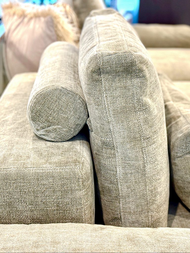背面クッションもフェザーを使用していますが、マクラのような支柱クッションが、