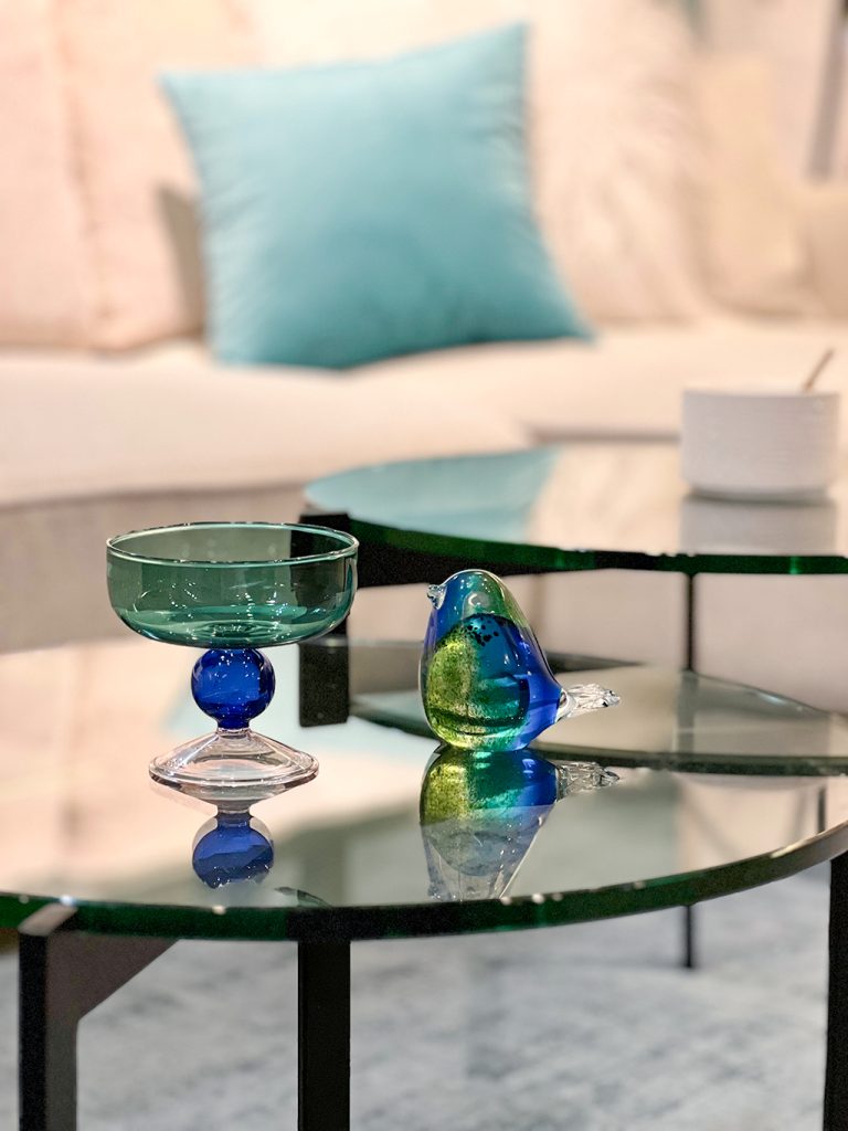 高さ違いのガラスのセンターテーブルと差し込み式のガラスのサイドテーブルも相性抜群。