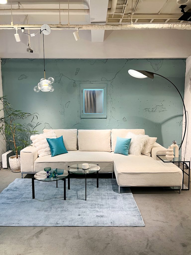 ラグやクッション、バックの壁も活用し今回のテーマである水色に全体を整え、涼し気な空気感に。
