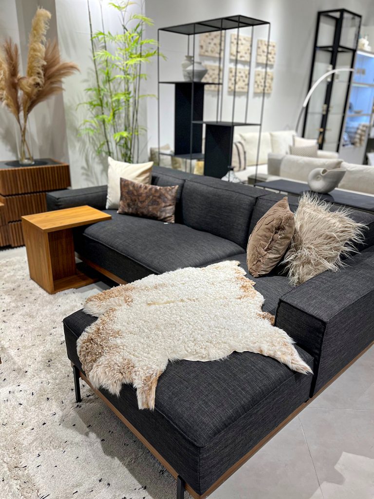 ソファのアイアン脚や、黒のガラス天板が、