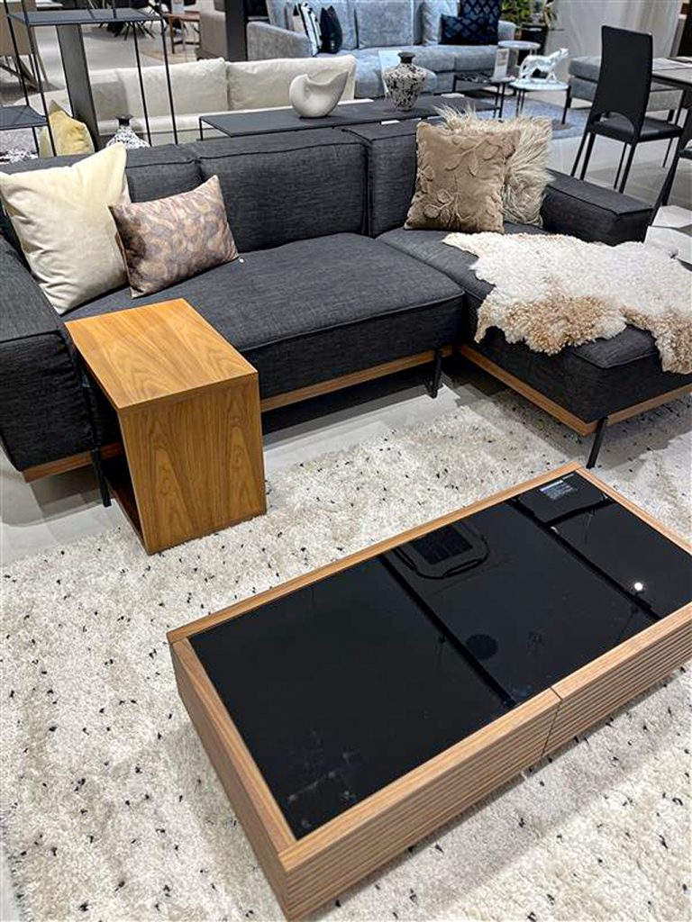 ・テーブル・チェストなどに、ウォールナットフレーム+黒のガラス天板を使用。