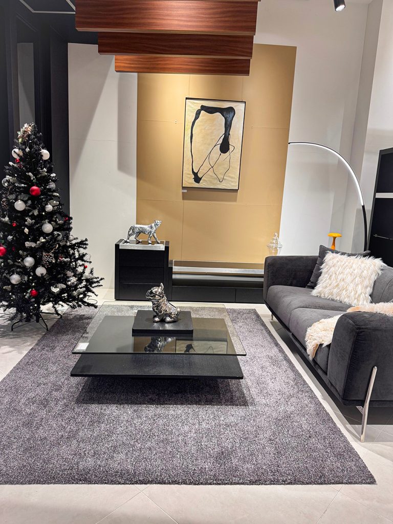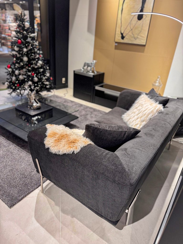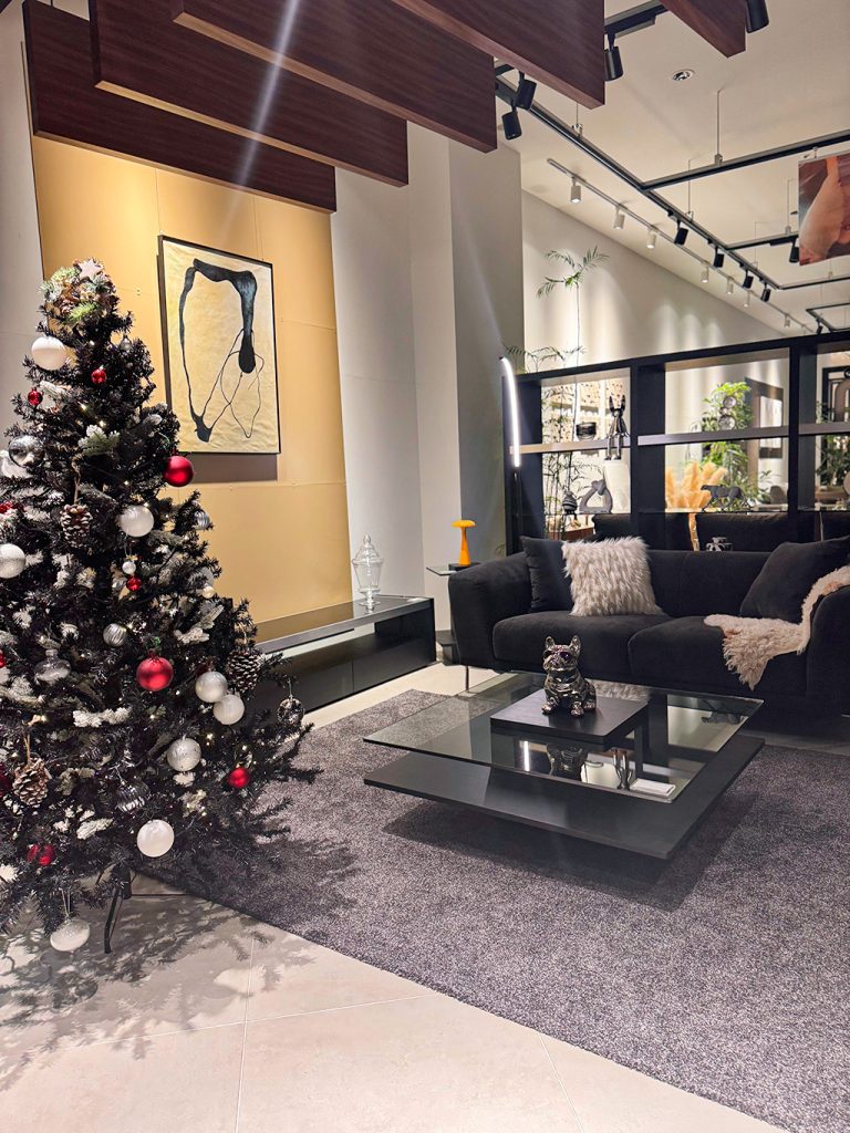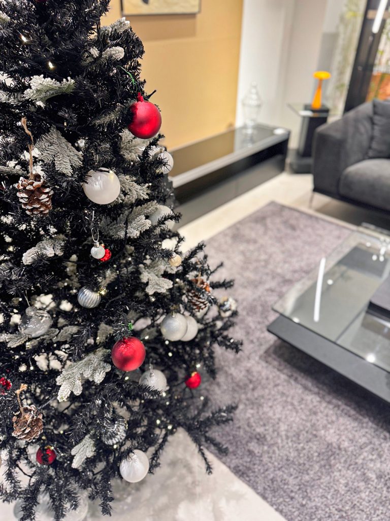 【Black-クリスマス】 黒基調のモダンインテリアに、スタッフ自信作の飾りつけツリーを設置。 シーンにまとまりがあるため、クリスマスツリーの赤が映えますね…✨