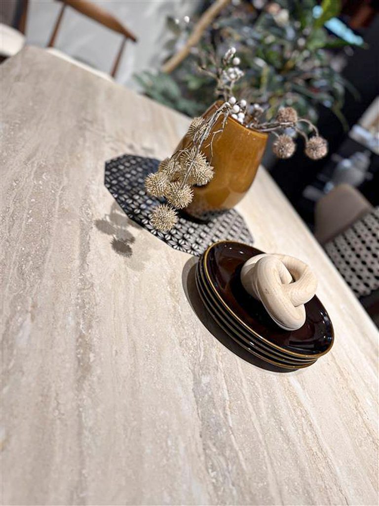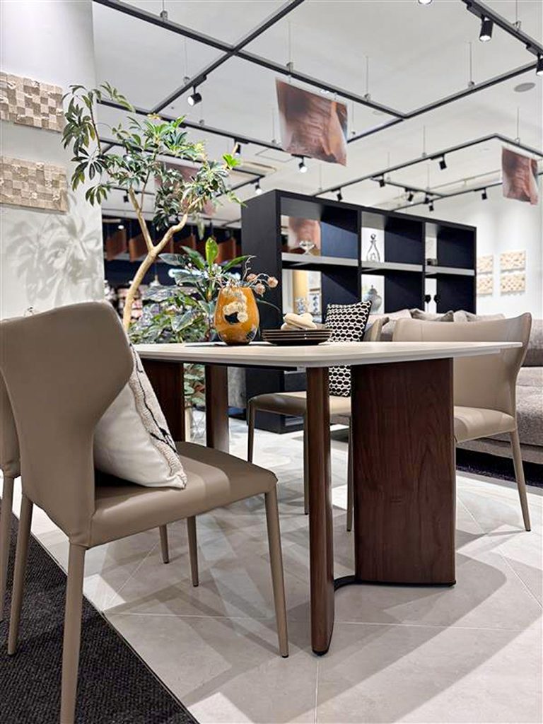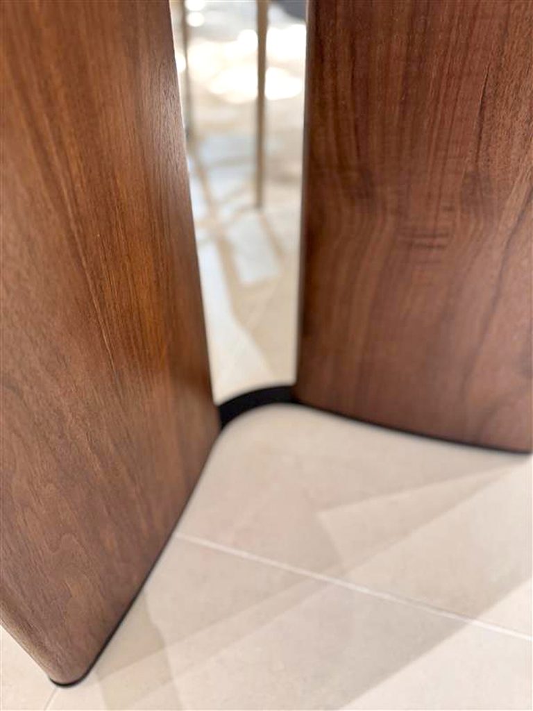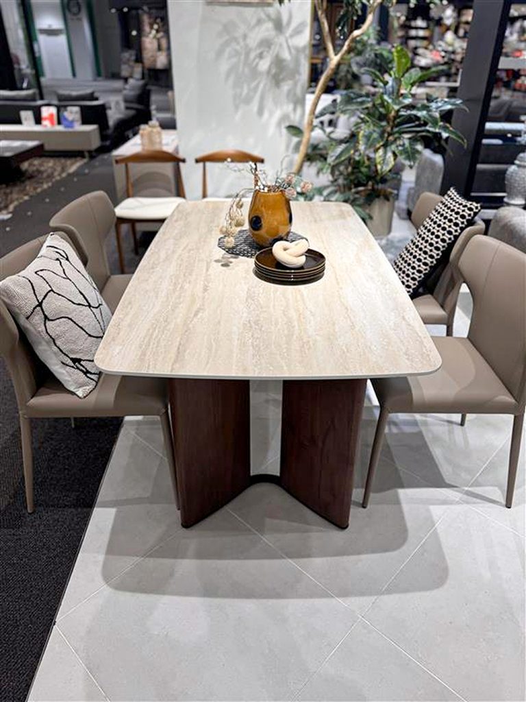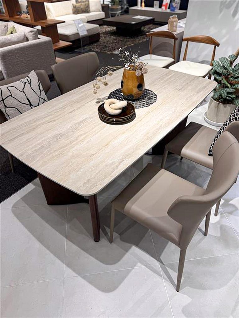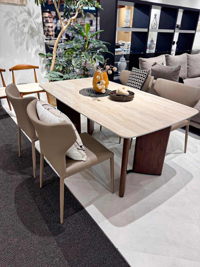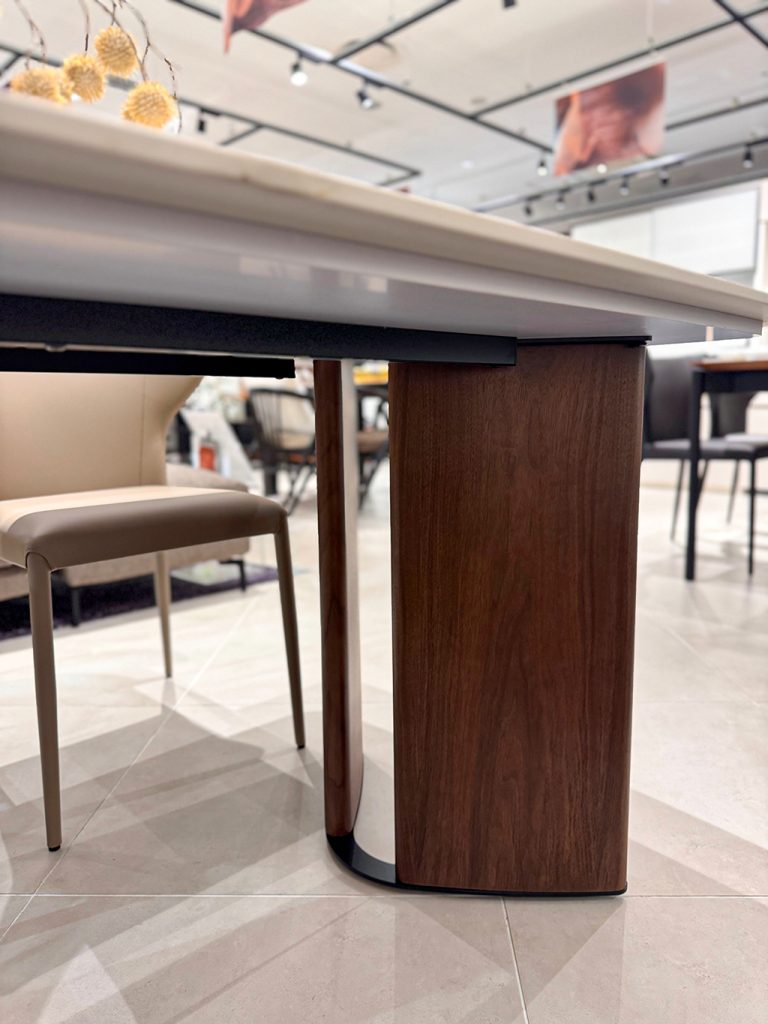 インテリアをホテルリゾート風にできる逸品で、天板の風合いは木目柄のセラミック。 足裏のアイアンもデザインの味となり、ディティール面も非常に良いダイニングです。