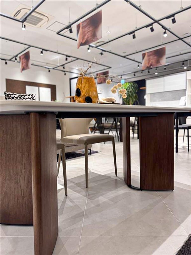 ARMONIAで新しく出たNEW DINING、「ARDT05」のご紹介。 ㇵの字足が特徴的でどの面からも足の収まりが良く、実用的でもあるデザイン✨ 天板はいい色合いのセラミックで、お手入れ面もバッチリです。